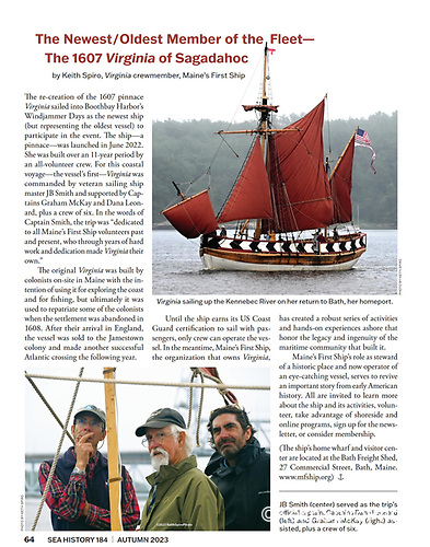 We provided full coverage for Virginia of Sagadahoc’s arrival at Boothbay Harbor Maine’s Windjammer Days 2023 and had a full page story and photos published in Sea History’s Autumn 2023 issue. As crewe member arriving in Boothbay aboard ship and land based imagery when it returned to home waters of the Kennebec River, we got to cover the Newest and simultaneously Oldest member of the flleet’s First Sail celebration.